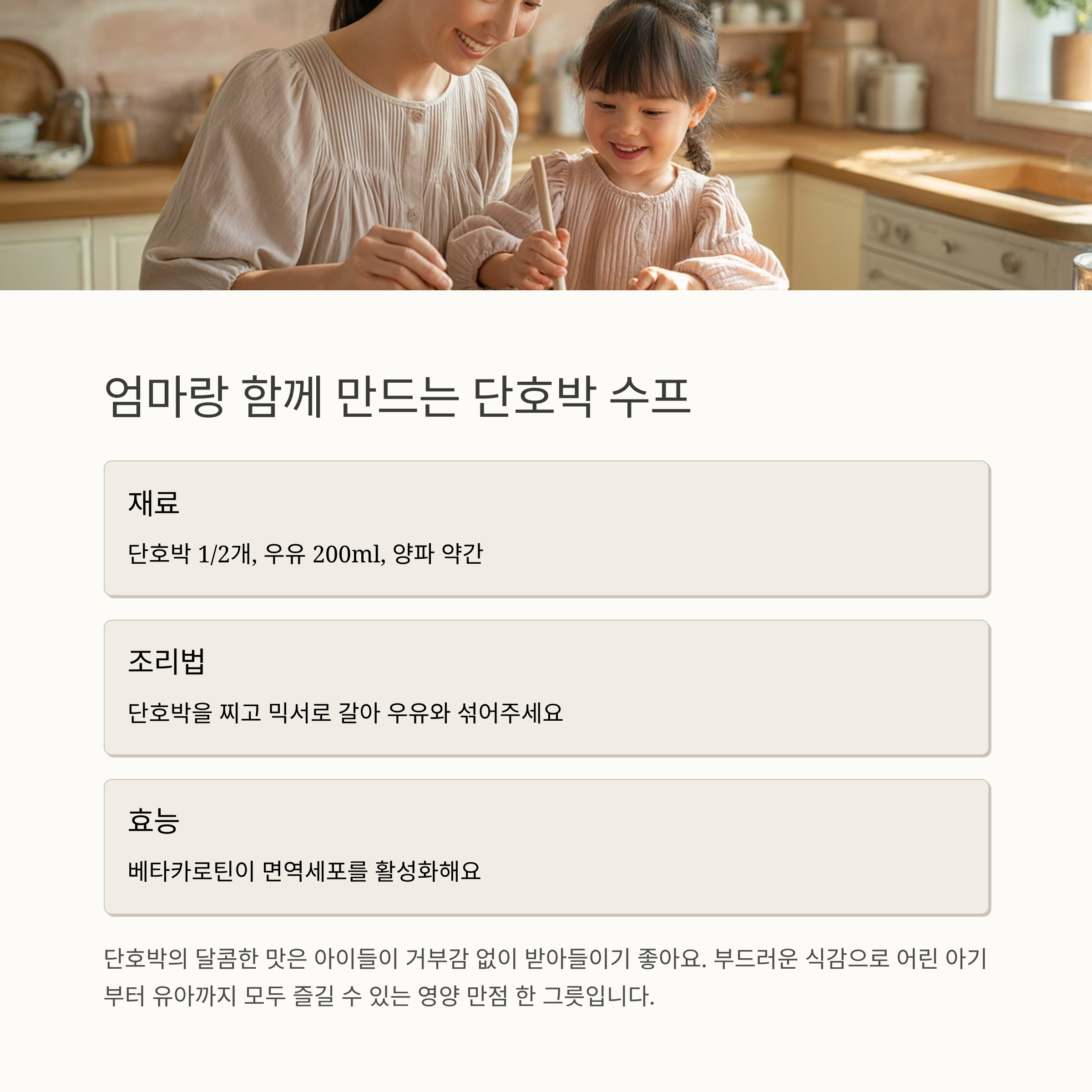 | 단호박 | 면역세포 활성화, 식이섬유 | 단맛이 나서 아이들 입맛에 적합 |