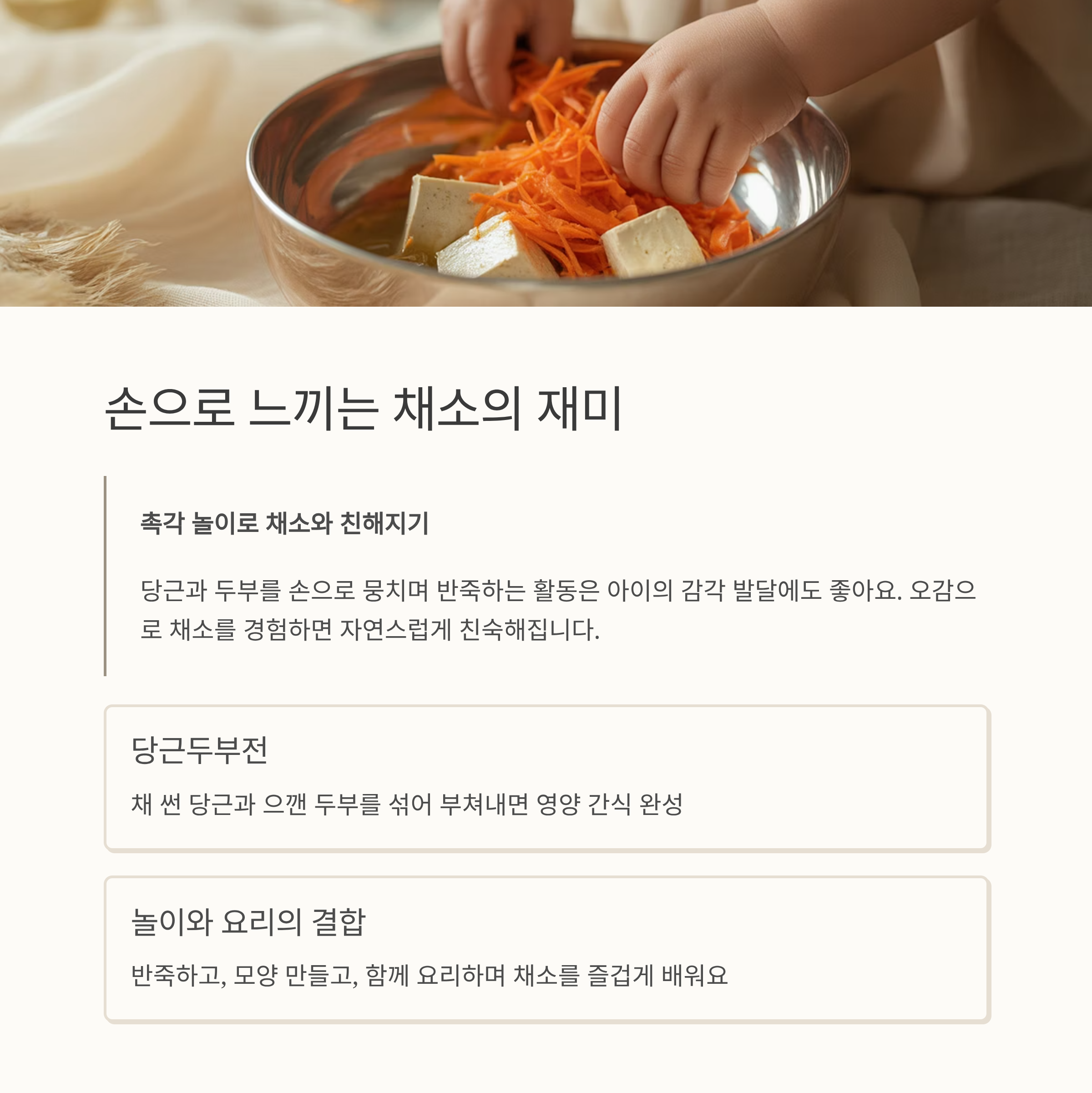 Point: 당근 맛이 두부에 잘 섞여 입안에서 부드럽게 퍼집니다. 아이 손에도 쏙!