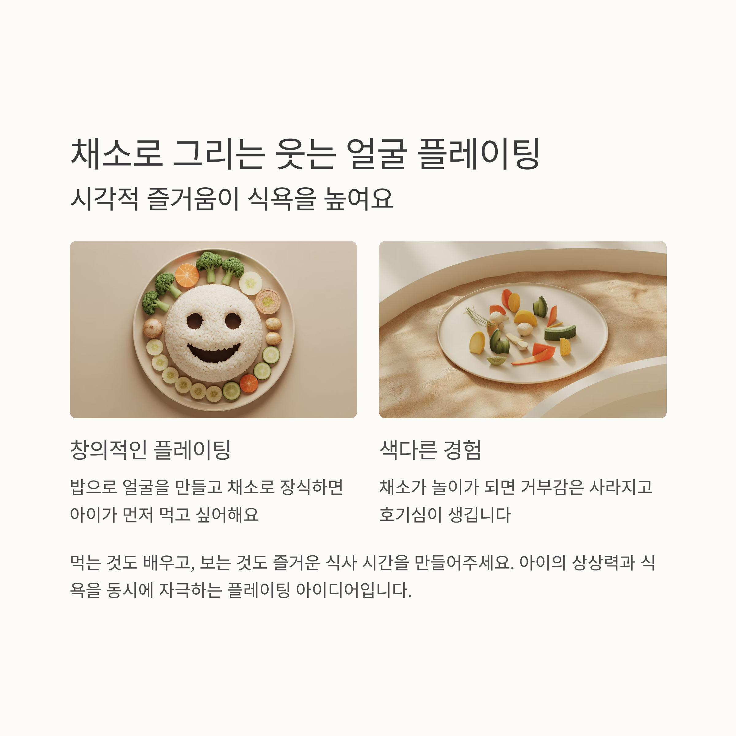 얼굴 모양, 무지개 색 플레이팅, 아이 접시 사용 등 시각적으로 접근하면 흥미가 올라갑니다.