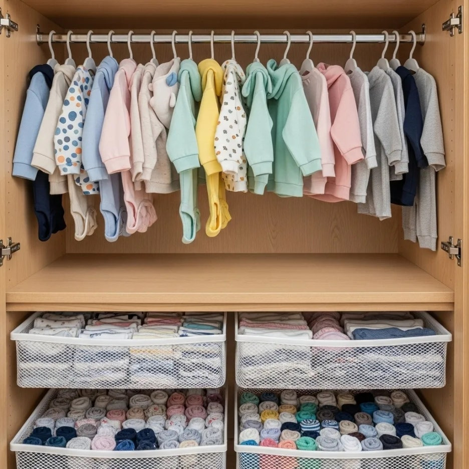 아기 내복, 가제 손수건, 양말 같은 작은 살림살이가 진짜 많은데, 이걸 일반 나무 서랍보다 메시 바구니에 넣으니 안이 들여다보여서 찾기도 쉽고 통풍도 잘 돼서 좋아요.