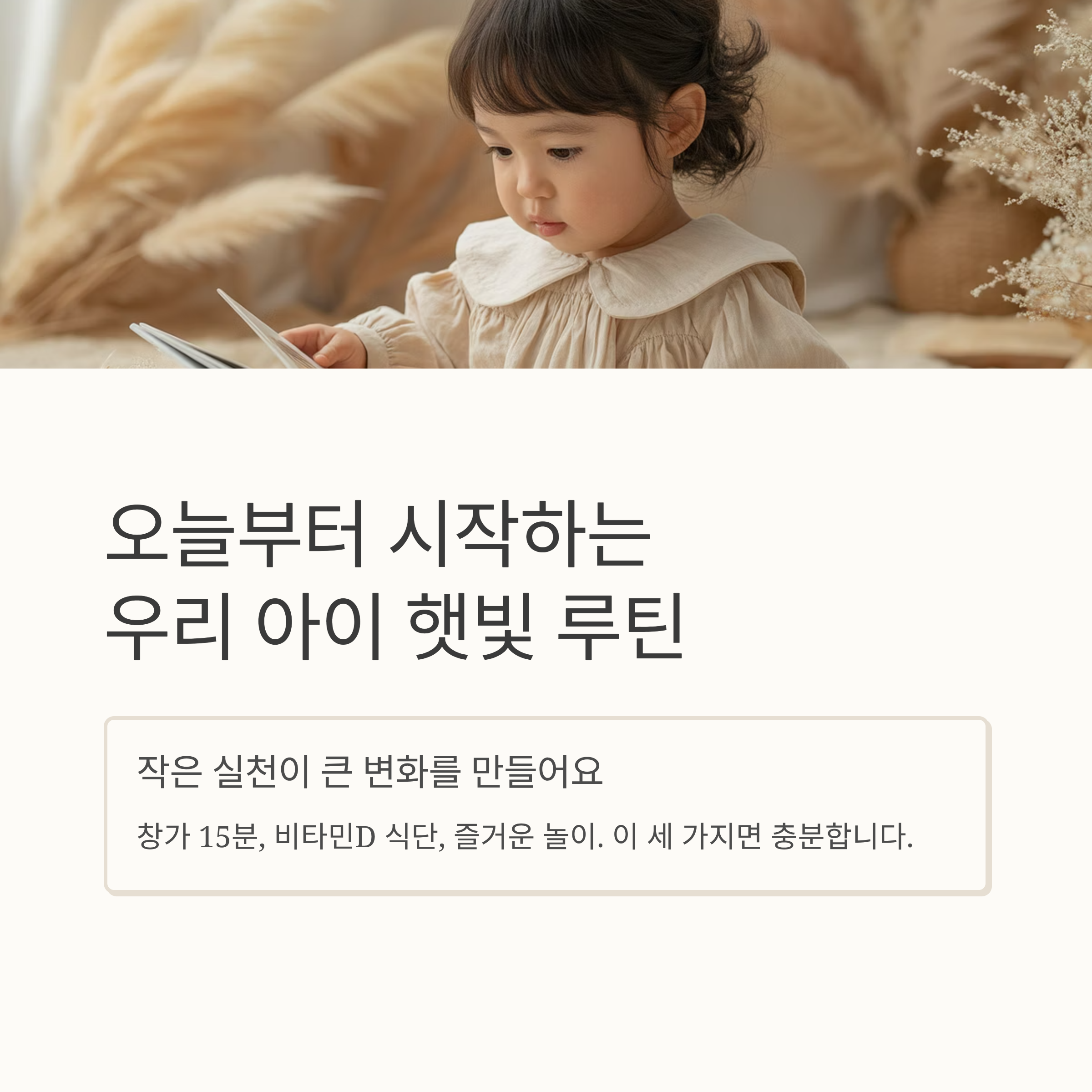 → 날씨가 허락된다면 꼭 창가 말고 바깥 산책도 병행하세요. - 자외선 차단제는 얼굴 위주로, 팔·다리는 노출