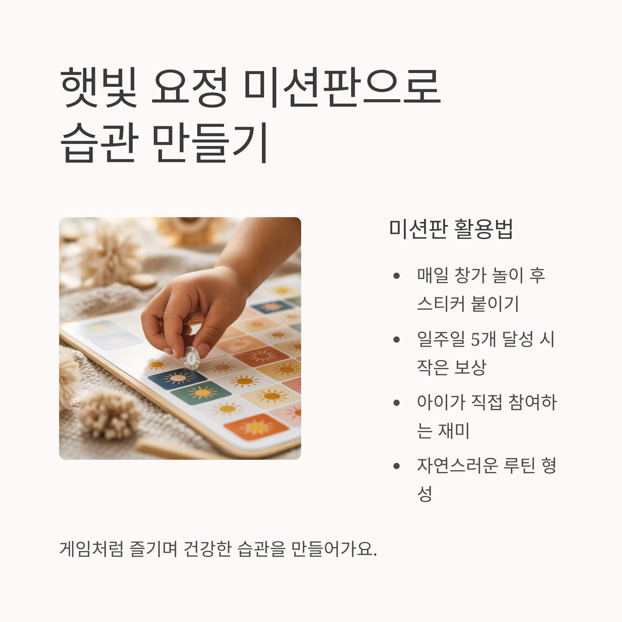 - “햇빛 미션 완료!” 도장판 만들기 (일주일에 3번 창가 놀이 성공 시 보상)