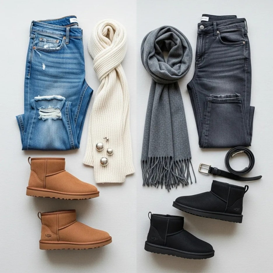 흑청이나 그레이 데님에 블랙 어그를 매치해보세요.