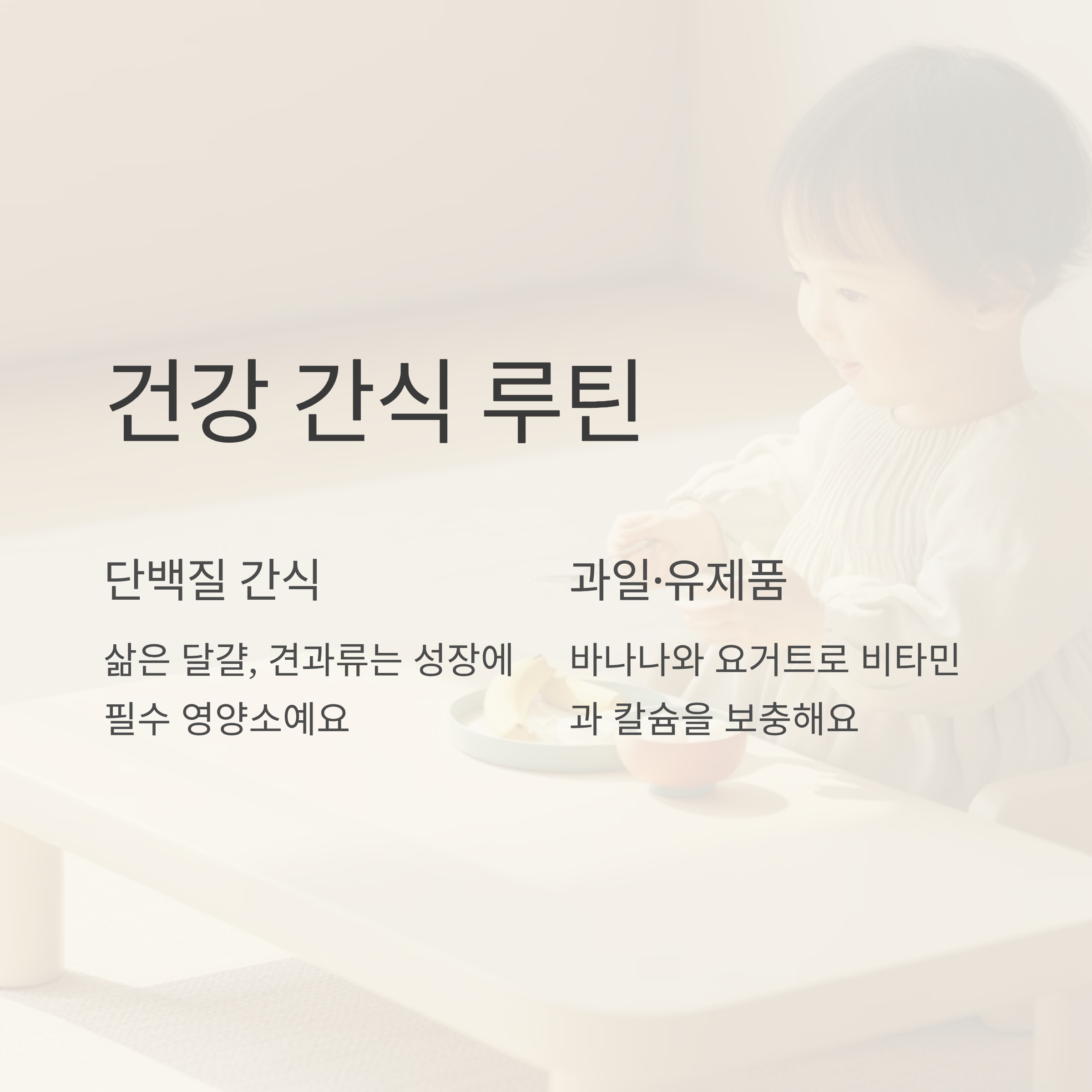 | 건강 간식 | 성장 보조, 에너지 유지 | 2분 |