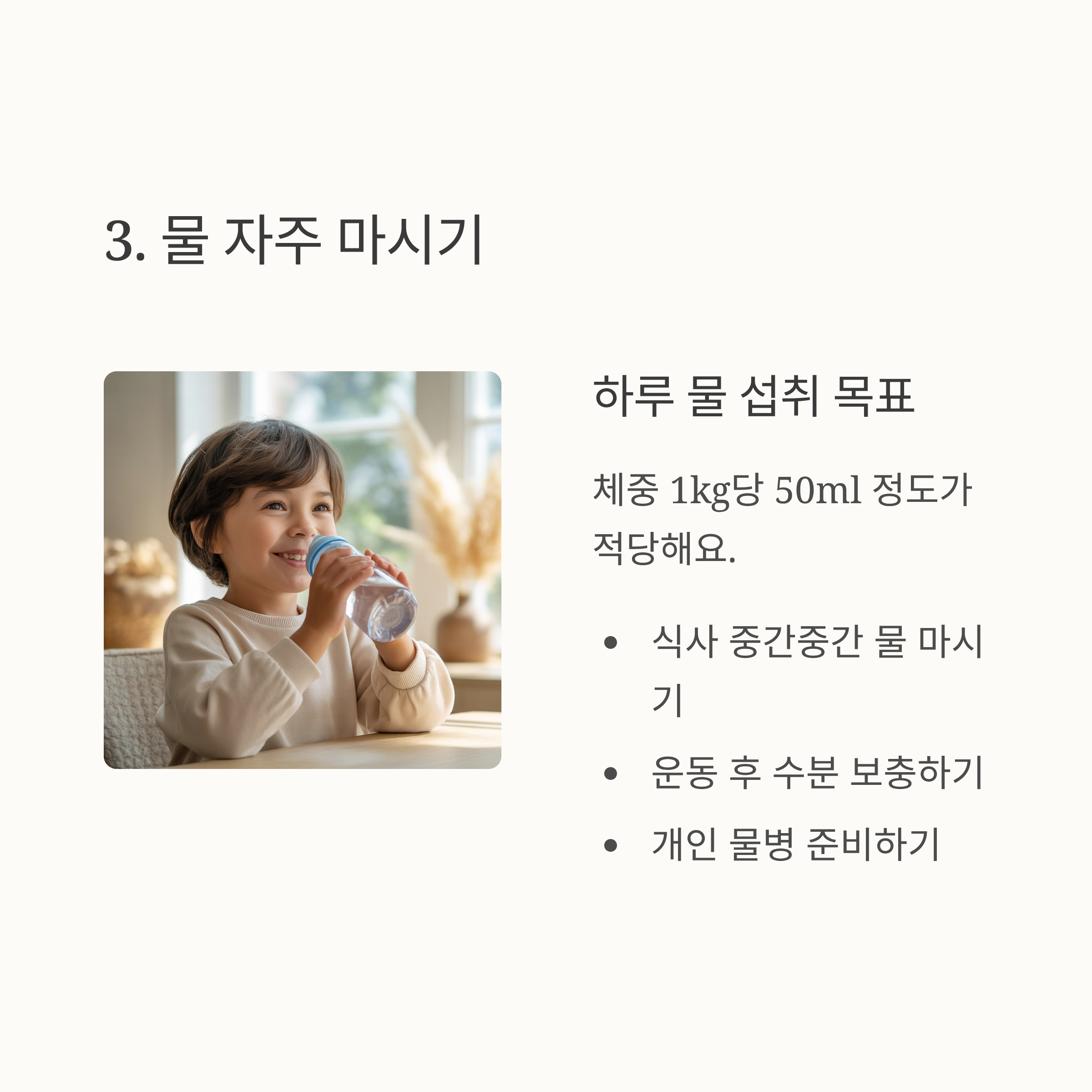 입학 전에는 **“목마르지 않아도 수시로 물을 마시는 습관”**을 만들어 주세요.