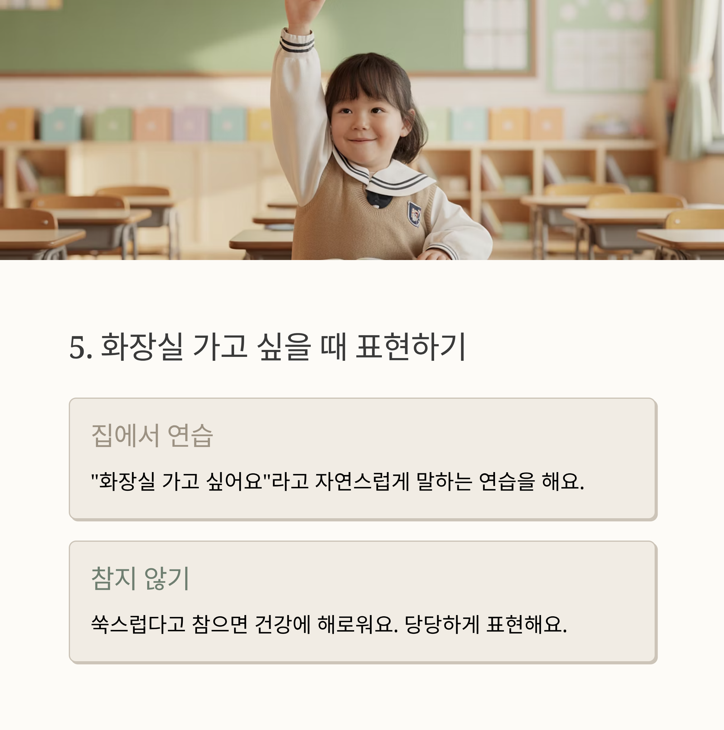 또한 교실에서 손들고 화장실 요청하는 연습도 필요합니다.