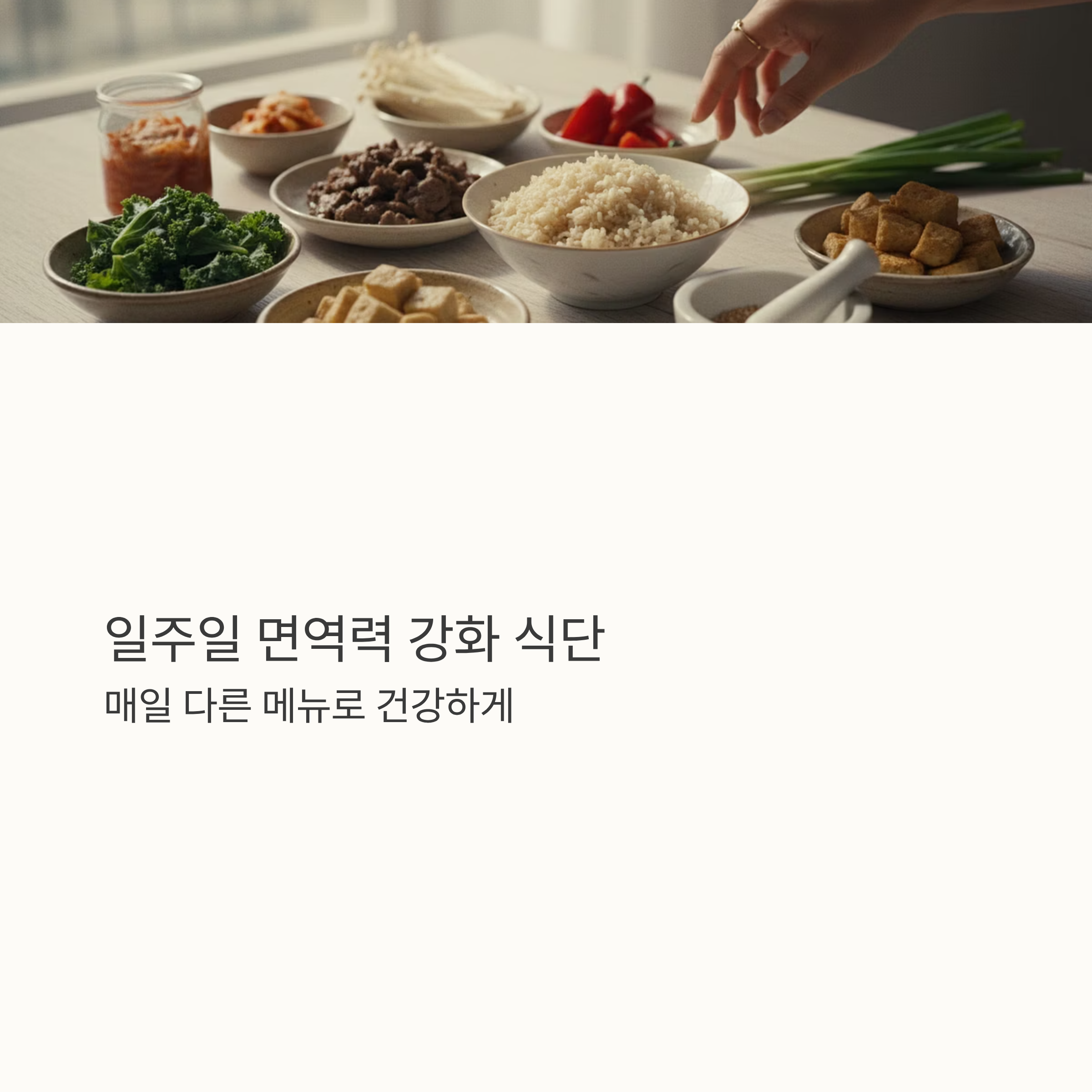 매일 다른 메뉴로 구성된 일주일 면역력 강화 식단표를 소개할게요. 이 식단은 비타민, 미네랄, 단백질, 항산화물질을 고루 섭취해 면역 시스템을 자연스럽게 강화할 수 있도록 짜였습니다. 계절(겨울)을 고려해 따뜻하고 소화에 좋은 음식, 비타민 D, C, 아연, 셀레늄 등을 중심으로 구성했습니다.