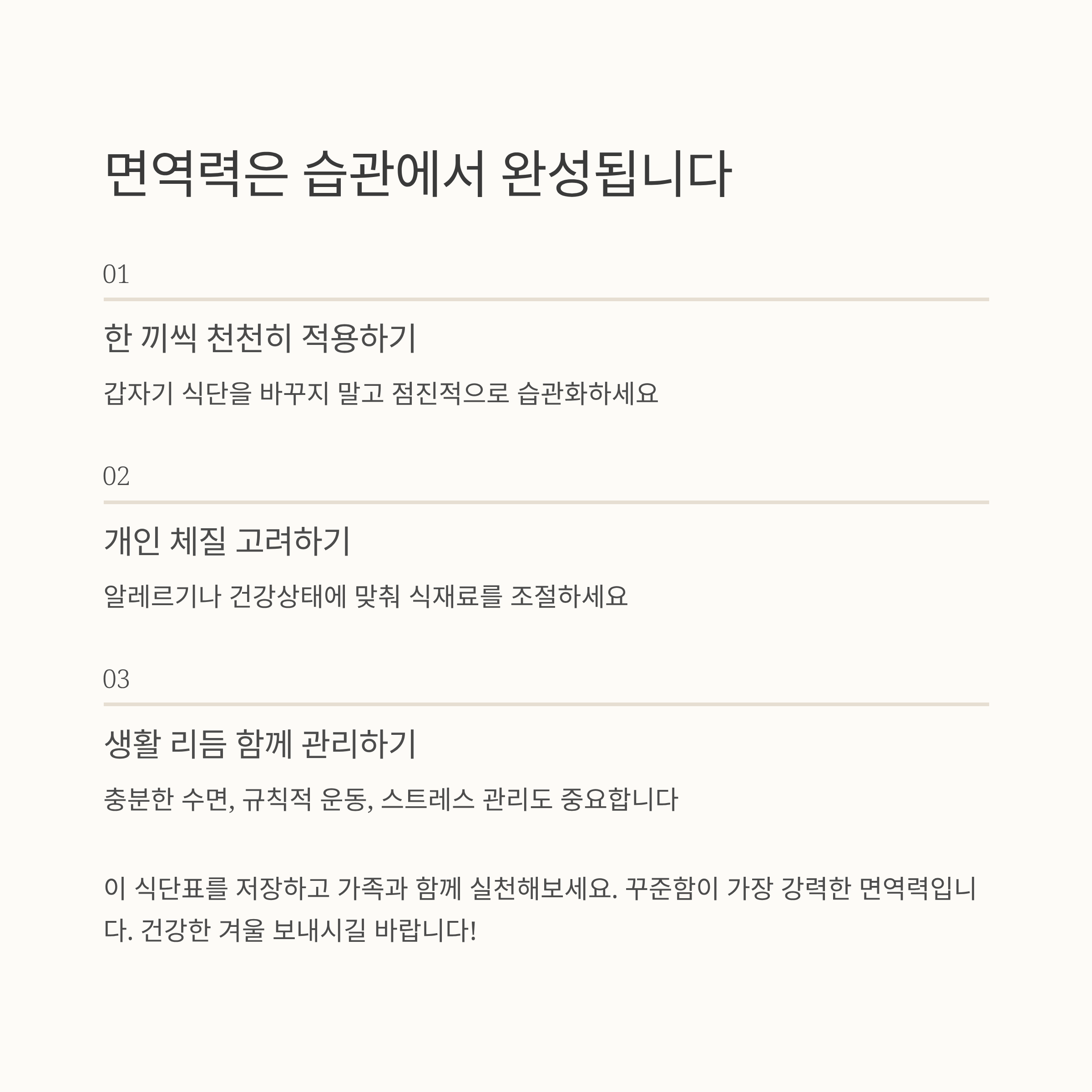 - 꾸준한 수면, 운동, 스트레스 관리도 함께 실천해야 면역이 완성됩니다