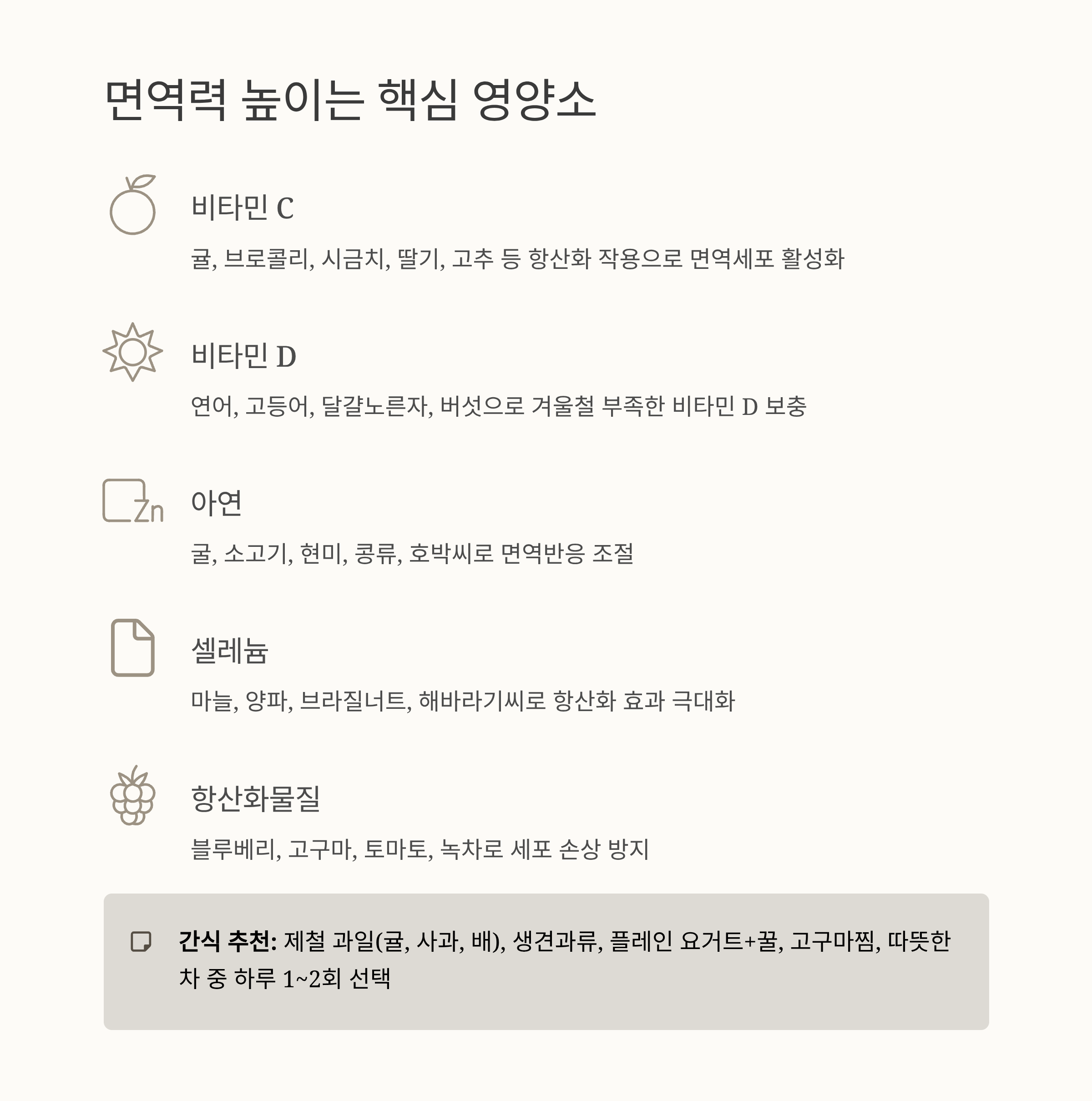 - 하루 1~2잔의 따뜻한 면역차(생강차, 유자차, 도라지차 등) 권장