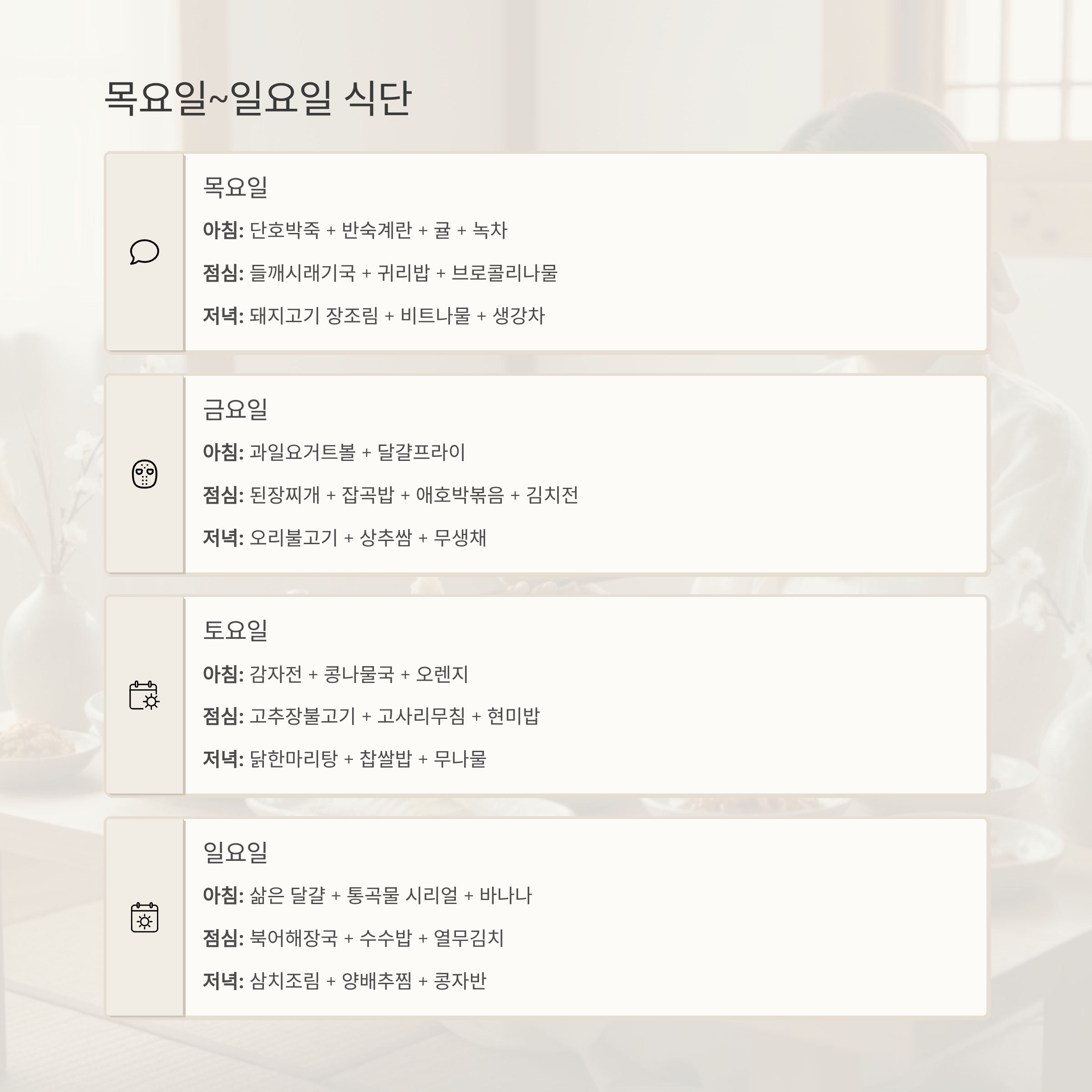 - 식단은 개인의 체질, 알레르기, 건강상태에 따라 조절 필요