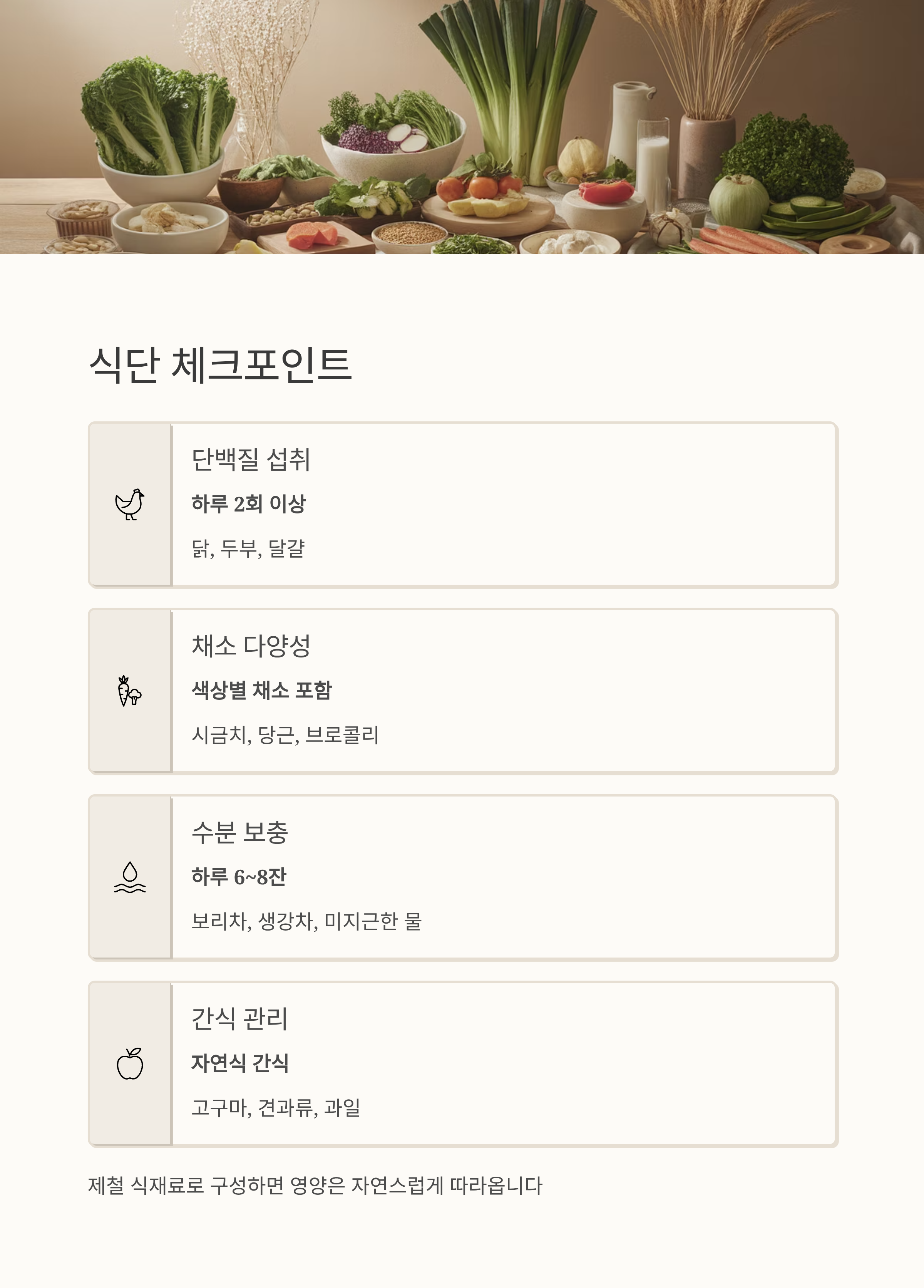 | 단백질 섭취 | 하루 2회 이상 | 닭, 두부, 달걀 |