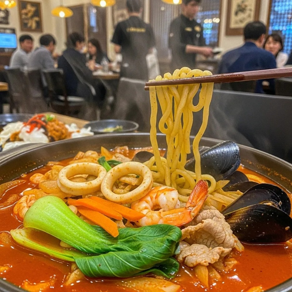 불맛 가득한 육수에 싱싱하고 부드러운 새우와 오징어, 숙주, 바지락, 불고기 등이 아낌없이 들어가 그 깊은 맛을 더해주며, 탱탱한 면발과의 조화가 완전 예술이라는 평을 받습니다.