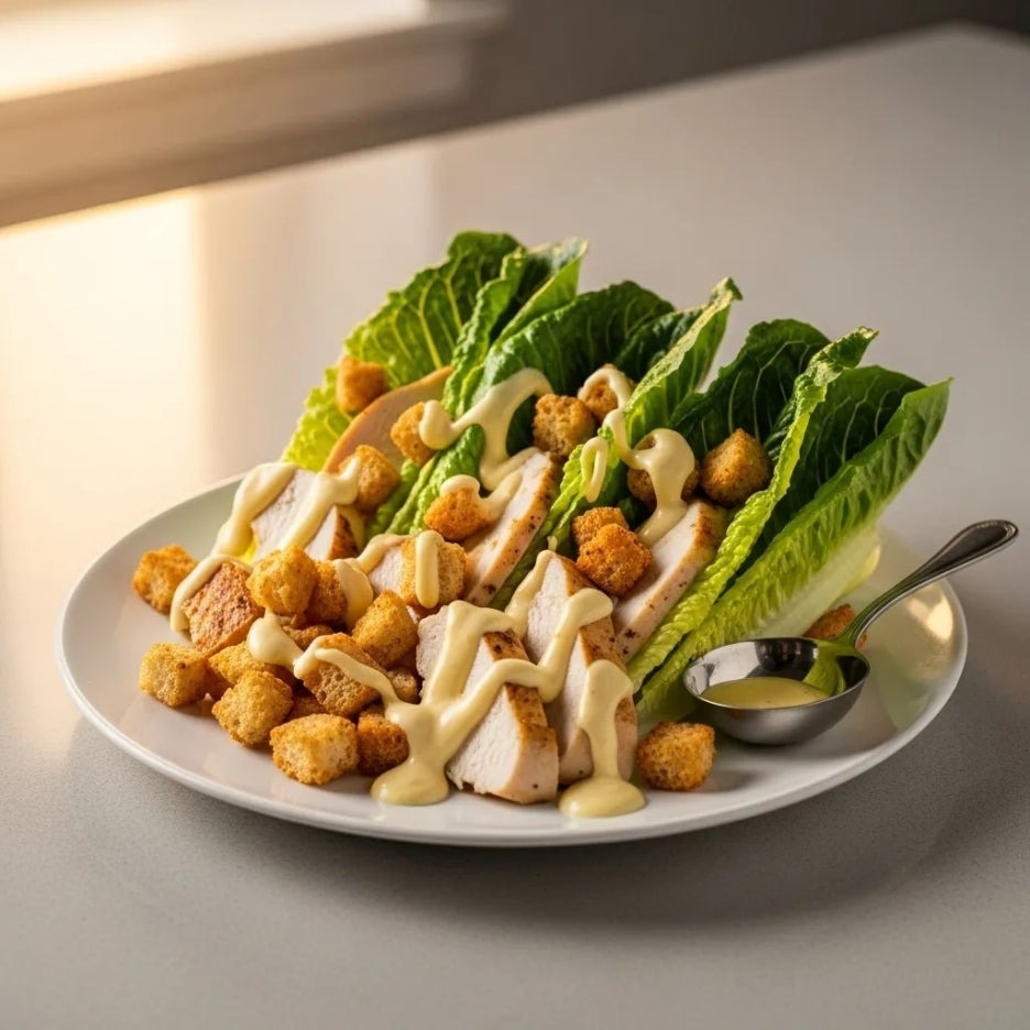 시저샐러드는 양상추, 닭가슴살, 크루통, 치즈, 시저드레싱으로 간단하게 만들 수 있어요.
